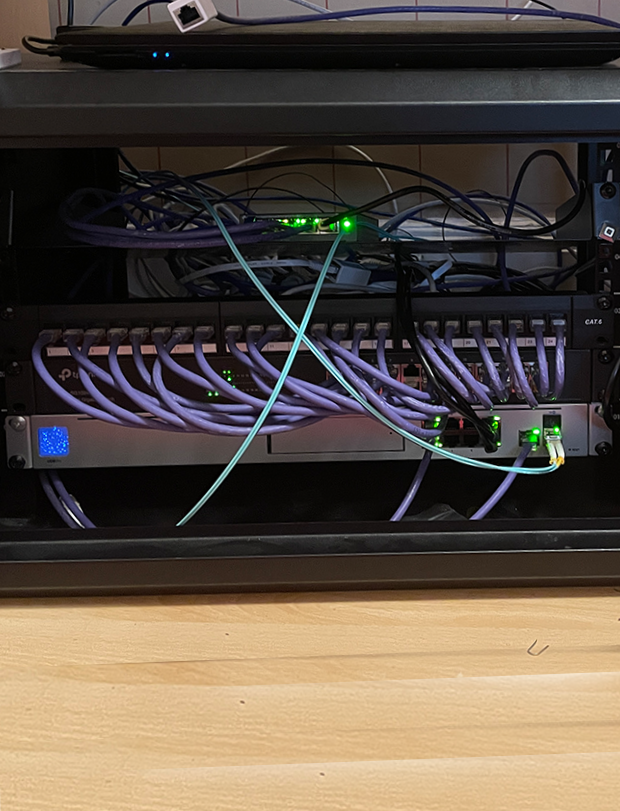 This gigabit up and down conection is made the most of by using the unify UDM Pro and multiple 10 gigabit fibre optic cables running around the building. The setup is not just made up of fibre, closer devices are using CAT6A ethernet cables. The use of the POE swich allows securtiy cameras to be installed.